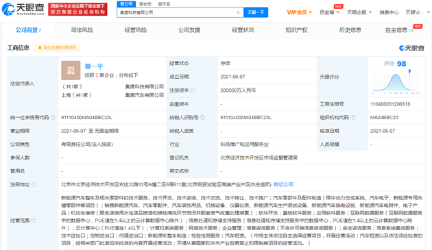 鞭牛士 6月10日上午消息,天眼查App显示,6月7日,集度科技有限公司成立,注册资本20亿人民币,法定代表人为夏一平。