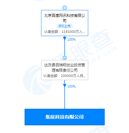 公司经营范围含新能源汽车整车及相关零部件的技术服务;新能源车整车制造;新能源汽车换电设施等。股权穿透图显示,该公司由北京百度网讯科技有限公司间接全资持股。