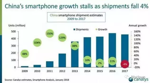 不过,根据此前工信部的数据,2017年国产智能手机市场衰退严重,而市场调研机构Canalys也有报告显示:2017年中国智能手机市场进入了负增长时代,2017年中国智能手机市场总出货量为4.59亿部,较2016年下跌4%。