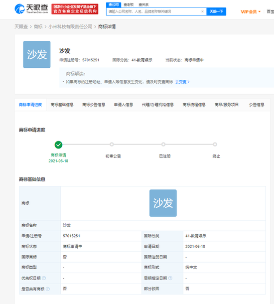 鞭牛士 6月28日消息,天眼查App显示,近日,小米科技有限责任公司申请注册“沙发”商标,国际分类为教育娱乐,目前商标状态为申请中。