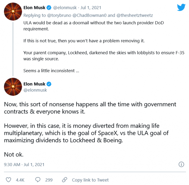 争议的核心是马斯克认为ULA得到了美国政府的大力支持,布鲁诺则坚决否认这一立场。马斯克发帖称:“如果不是美国国防部要求有两家发射提供商,ULA会死得很惨。”