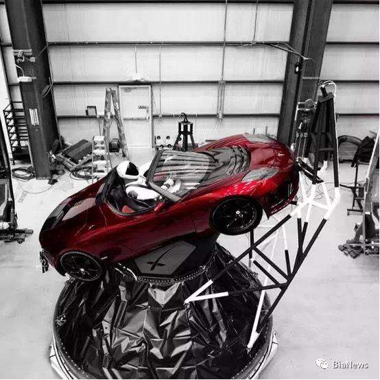 同时进入太空的还有一辆樱桃红特斯拉Roadster跑车,跑车被装进了火箭头部,跑车里甚至还坐了一名身穿太空服的假人。