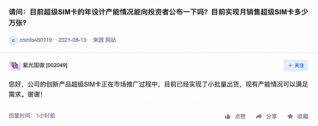 鞭牛士 8月29日消息,紫光国微在深交所“互动易”平台回答投资者提问时称:公司的创新产品超级SIM卡正在市场推广过程中,目前已经实现了小批量出货,现有产能情况可以满足需求。