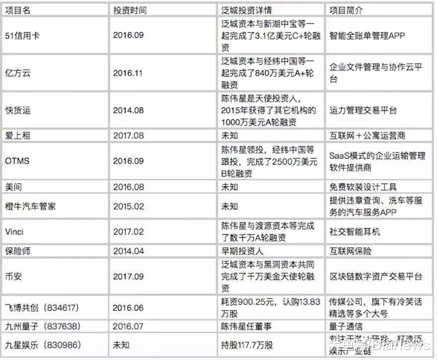 离开快的后,陈伟星转型投资人。投了以下项目: