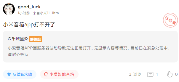 后续官方随后表示已确认小爱音箱 App 因服务器波动导致无法正常打开、无显示内容等情况,并在紧急处理中。