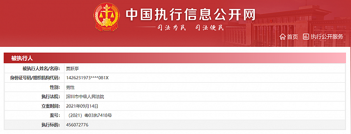 鞭牛士 9月16日消息,据中国执行信息公开网消息,9月14日,贾跃亭新增被执行人信息,执行标的456072768元,案号(2021)粤03执7418号,执行法院为深圳市中级人民法院,关联案件为金融借款合同纠纷。