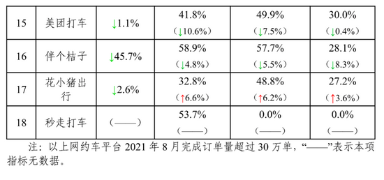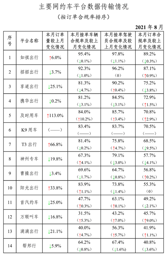 一、在订单量超过30万单的网约车平台中,订单合规率最高的是如祺出行,最低的是秒走打车。2021年8月订单量超过30万单的网约车平台共18家。与7月份相比,去哪儿专车从7月订单量超过30万单降到30万单以下;新增K9用车、秒走打车2家网约车平台订单量超过30万单。按订单合规率(指驾驶员和车辆均获得许可的订单量占比)从高到低的分别是如祺出行、招招出行、享道出行、携华出行、及时用车、K9用车、T3出行、神州专车、曹操出行、阳光出行、首汽约车、万顺叫车、滴滴出行、帮邦行、美团打车、伴个桔子、花小猪出行、秒走打车。本月订单合规率增长排名前3名的分别是万顺叫车、花小猪出行、及时用车;下降最多的分别是T3出行、伴个桔子、神州专车。