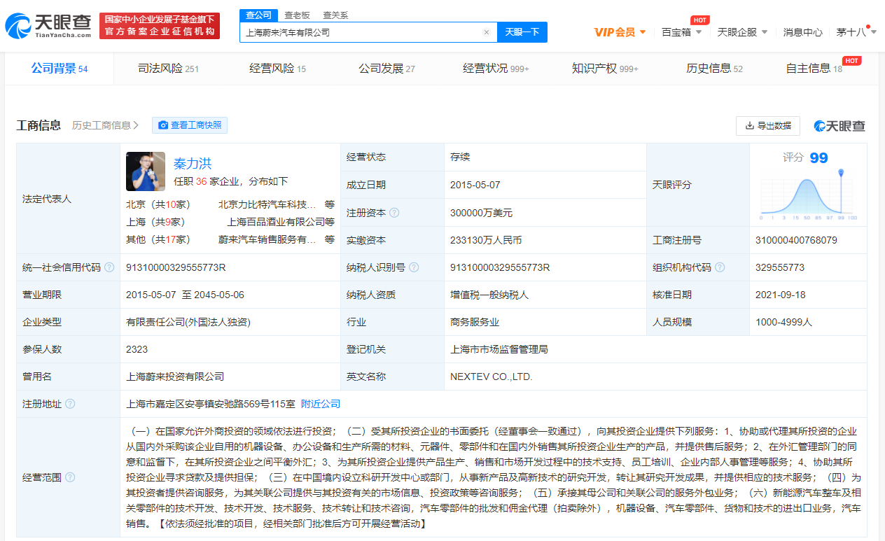 该公司成立于2015年5月,法定代表人为秦力洪,经营范围包括新能源汽车整车及相关零部件的技术开发等。股东信息显示,该公司由蔚来控股有限公司全资控股。
