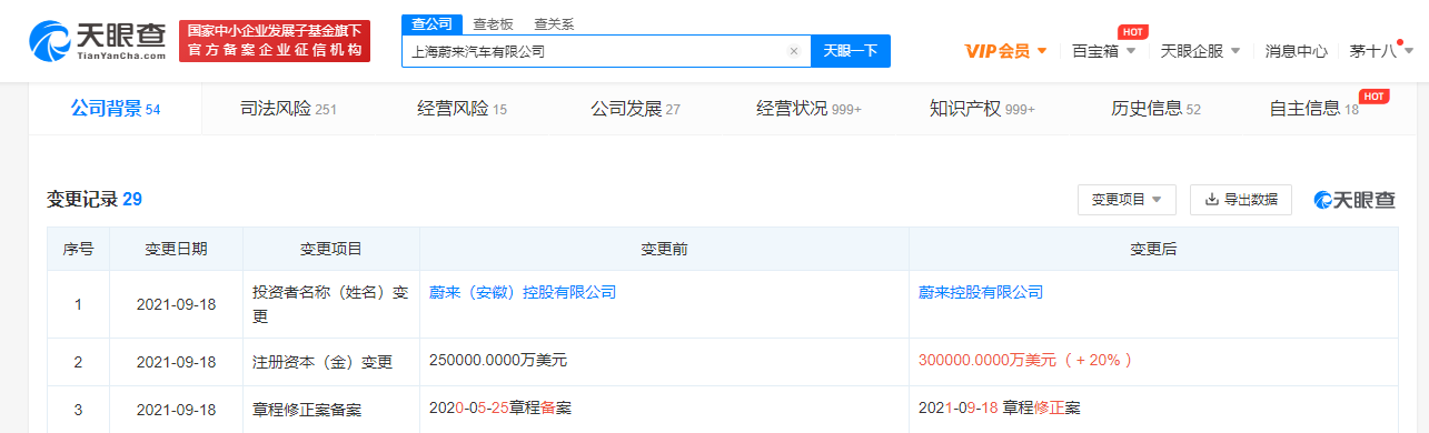 鞭牛士 9月22日消息,天眼查App显示,近日,上海蔚来汽车有限公司发生工商变更,注册资本由25亿美元增至30亿美元,增幅20%。