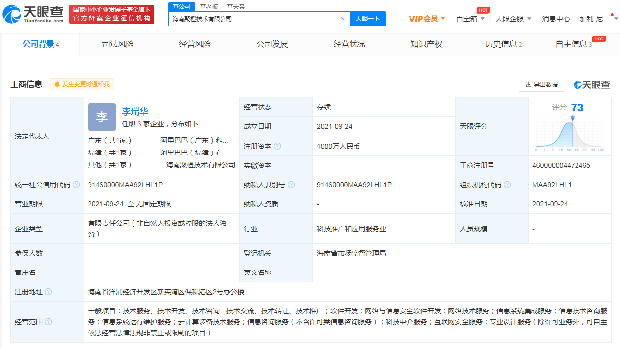 鞭牛士 9月26日消息,天眼查App显示,9月24日,海南聚橙技术有限公司成立,法定代表人为李瑞华,注册资本1000万人民币,经营范围包括网络与信息安全软件开发;信息系统运行维护服务;互联网安全服务等。股东信息显示,该公司由阿里巴巴(中国)有限公司全资控股。