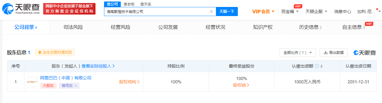 阿里在海南成立新公司,注册资本1000万元