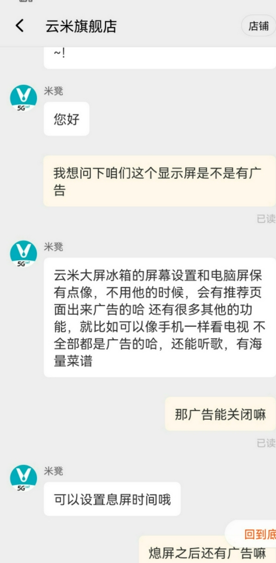 云米冰箱客服回应强制播放广告:现在可以关闭,教程晚点出来