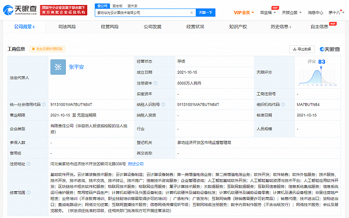 廊坊华为云计算技术有限公司成立,注册资本5000万