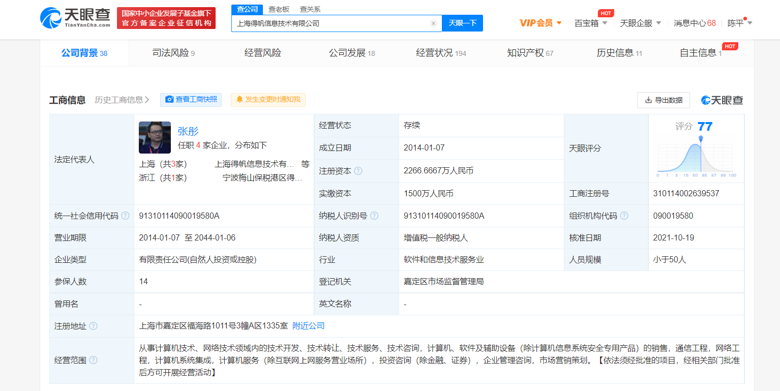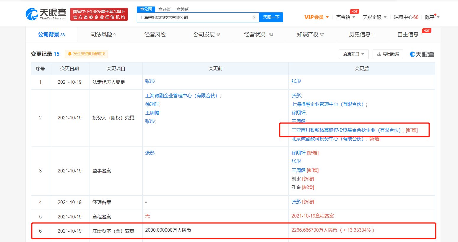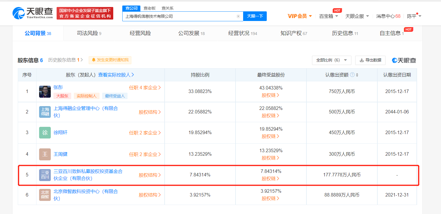鞭牛士 10月20日消息,天眼查App显示,10月19日,上海得帆信息技术有限公司发生工商变更,新增百度关联公司三亚百川致新私募股权投资基金合伙企业(有限合伙)等为股东,同时公司注册资本由2000万人民币增至约2266.67万人民币,增幅约13.33%。