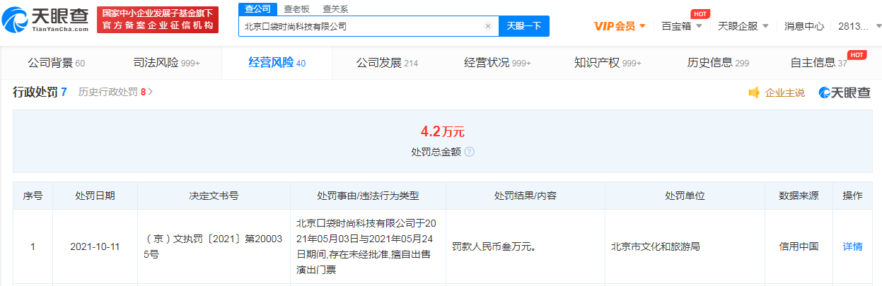鞭牛士 10月20日消息,天眼查App显示,近日,微店关联公司北京口袋时尚科技有限公司新增一条行政处罚信息,处罚事由为该公司于2021年5月3日与2021年5月24日期间,未经批准擅自出售演出门票,处罚结果为罚款3万元,处罚单位为北京市文化和旅游局,决定文书号(京)文执罚〔2021〕第400561号。